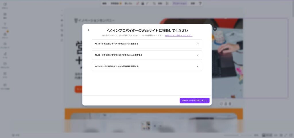 DNS設定が完了したら、Canvaに戻って「DNSレコードを作成しました」をクリックします。