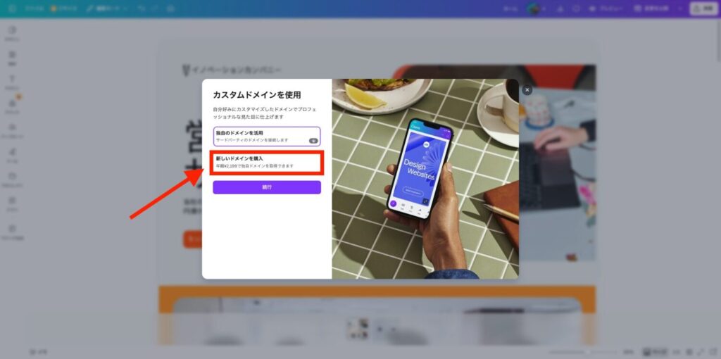 「新しいドメインを購入」をクリックして、「続行」をクリックします。