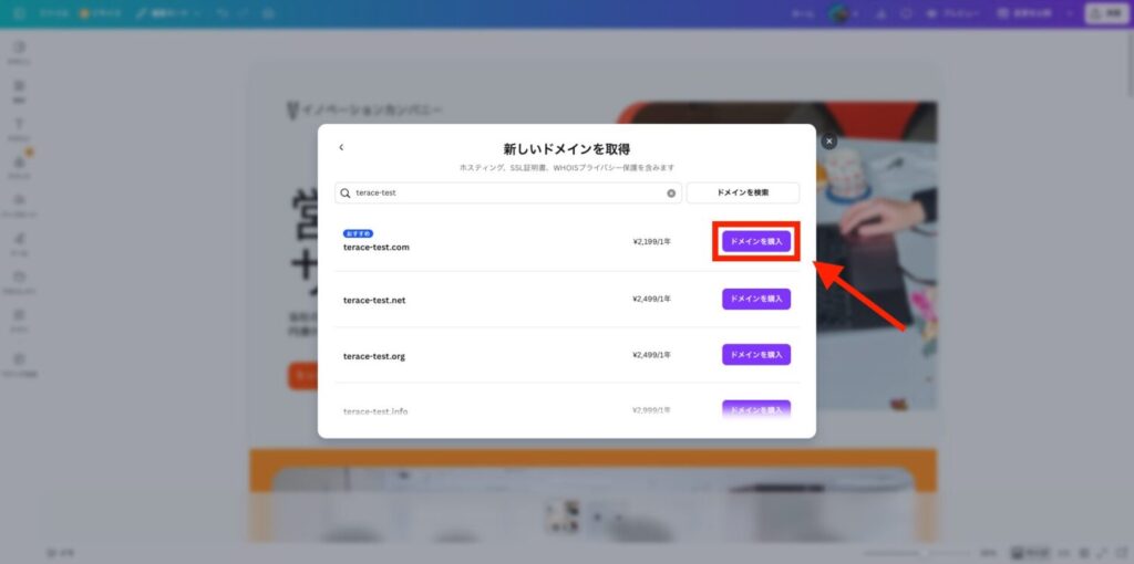 好きなドメインを選んで、「ドメインを購入」をクリックします。
