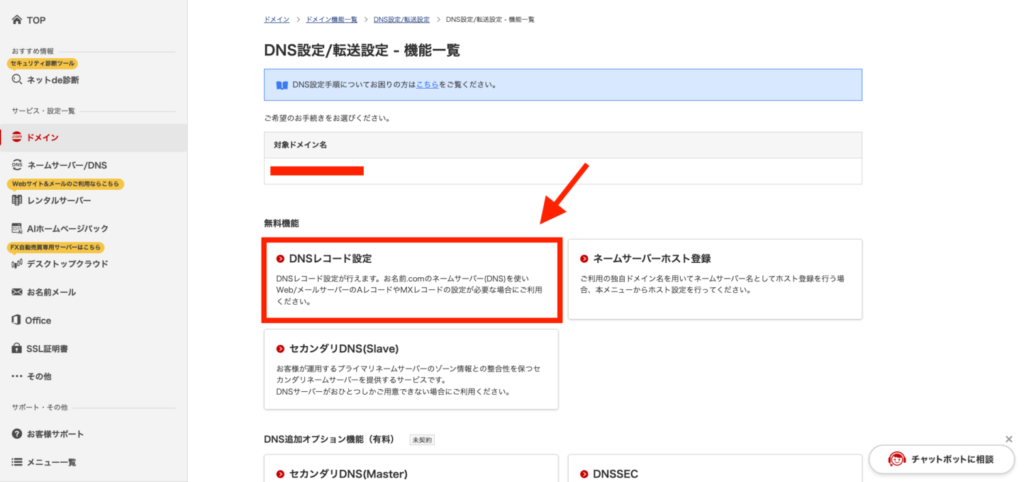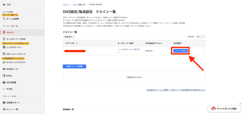 左側メニューの「ネームサーバー/DNS」→「ドメインDNS設定」をクリックします。