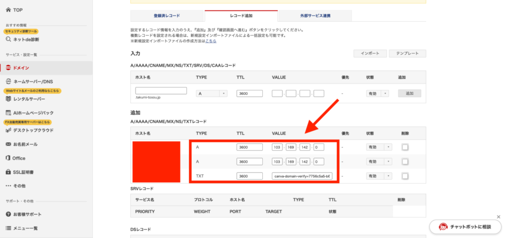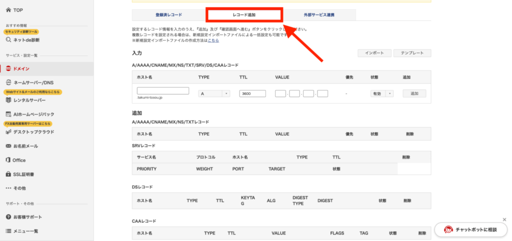 レコード追加の案内が出てくるので、見ながらDNS設定を行います。