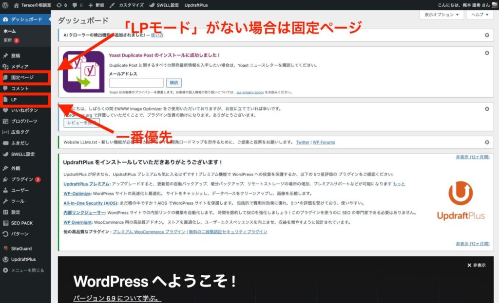 コピーしたHTML埋め込みコードを貼り付けていきますが、「LPモード」があればLPモードを選択、なければ固定ページを選択するのがいいかと思います。