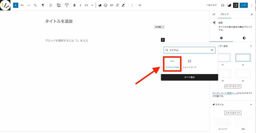 「カスタムHTML」というブロックを追加します。