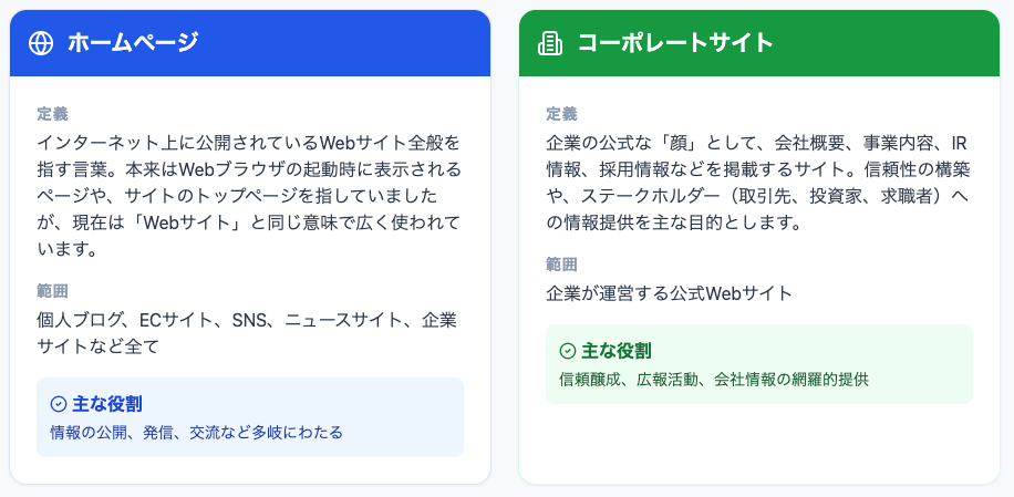 実はこの2つ、同じようでいてまったく別物です。コーポレートサイトは信頼を生む企業の公式窓口になるサイト、ホームページはWeb上のすべてのサイトという広い意味を持ちます。