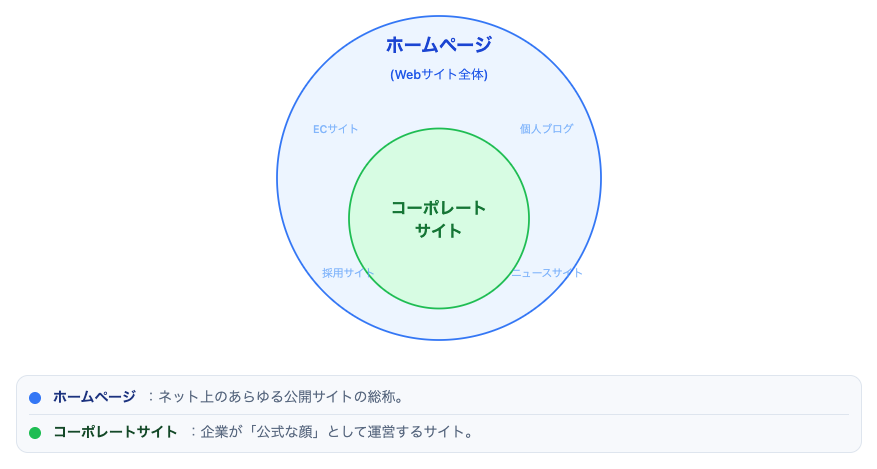 もっとわかりやすく図解すると、コーポレートサイトとホームページは下記の関係図になります。
