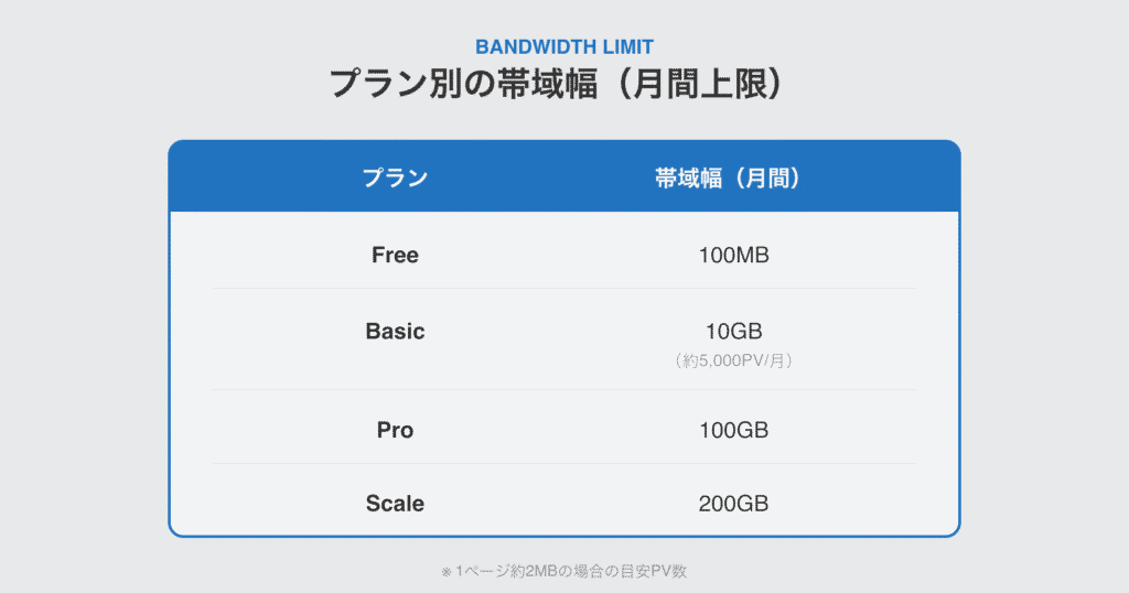 Basicプランの帯域幅は月10GBです。目安として、平均的なサイト(1ページあたり約2MB)なら月間約5,000PV〜10,000PVまで対応できます。