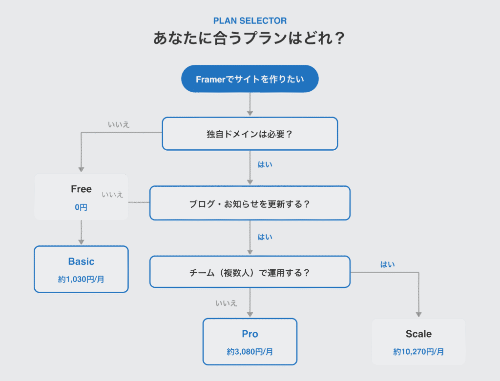 Framerは、デザインの自由度が高いノーコードツールです。料金体系はドル建てでわかりにくい部分もありますが、整理してみると選び方はシンプルです。
