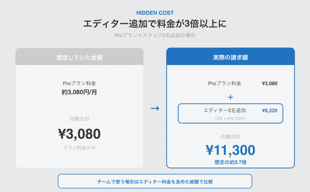 ただし、プラン料金の他にエディター追加費が別でかかります。表面の金額だけで判断すると、想定の2〜3倍になるケースもあります。