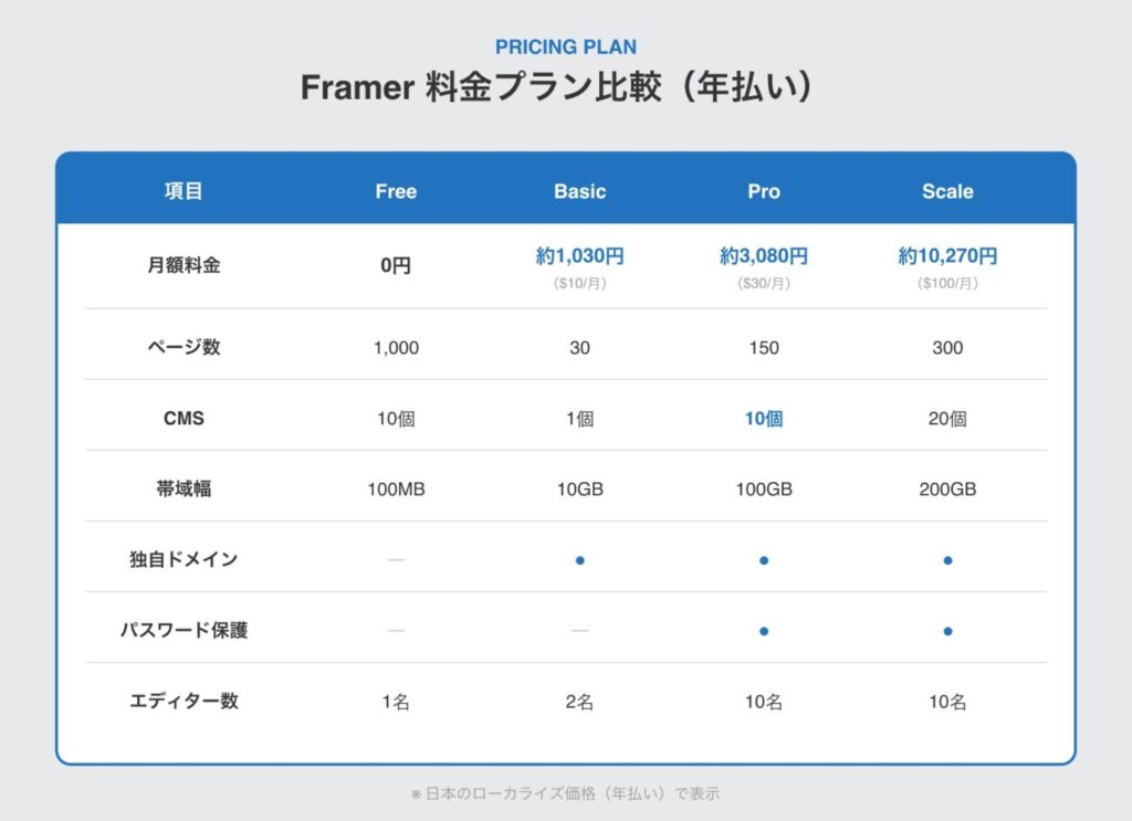 Framerの料金はドル建てですが、日本には独自のローカライズ価格が適用されているため、安心なのは安心です。