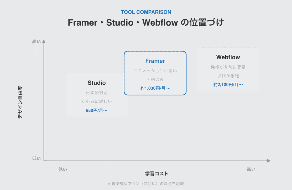 | 比較項目 | Framer | Studio | Webflow |