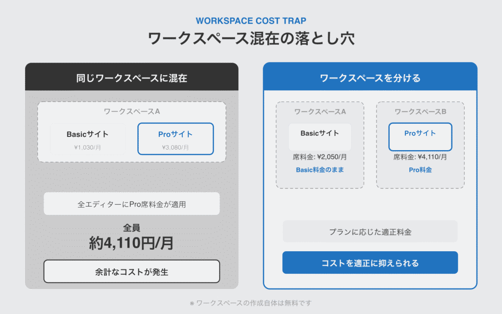 あなたがBasicサイト1つとProサイト1つを同じワークスペースで管理しているとします。この場合、Basicサイトだけを編集するスタッフにもProの席料金(約4,110円/月)がかかります。Basicの席料金(約2,050円/月)ではなく、ワークスペース内で最も高いプランの料金が全員に適用されるルールです。