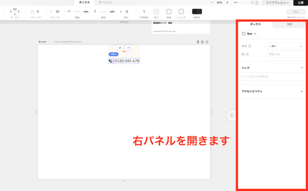 • 電話番号を設定したい要素を選択して、右パネルを開く