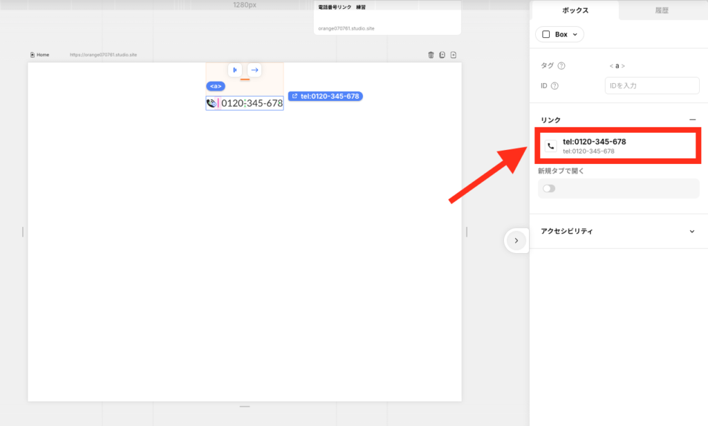 Studioで電話番号リンクを設定する手順は、下記のとおりです。