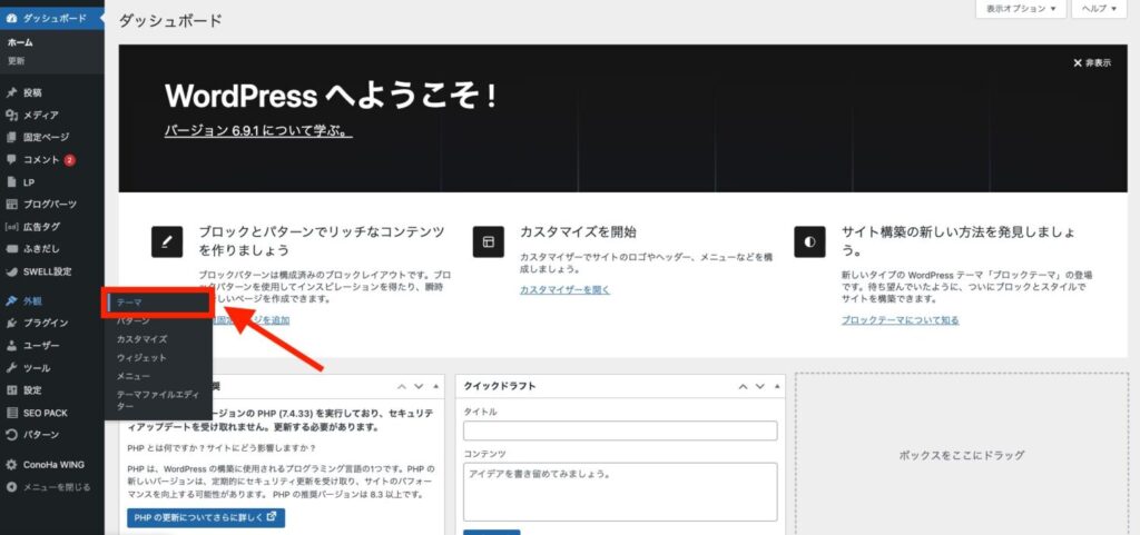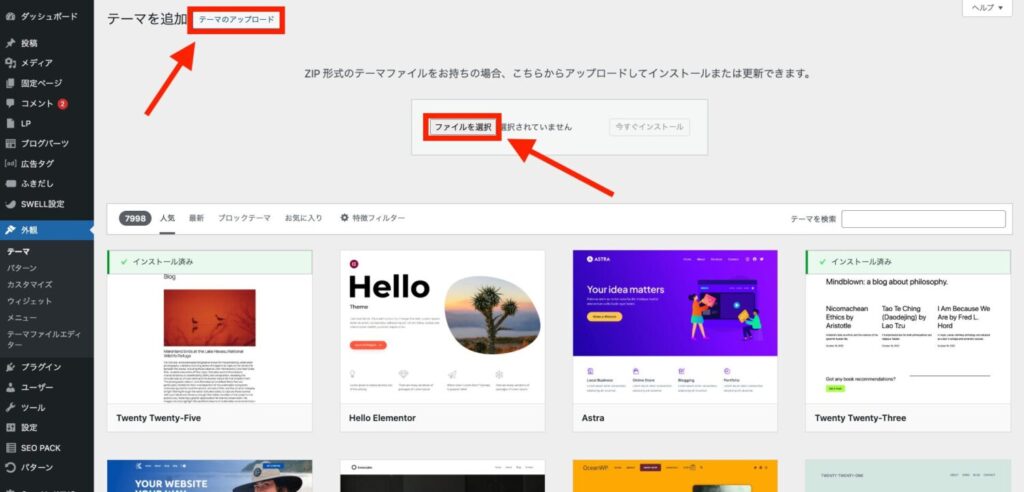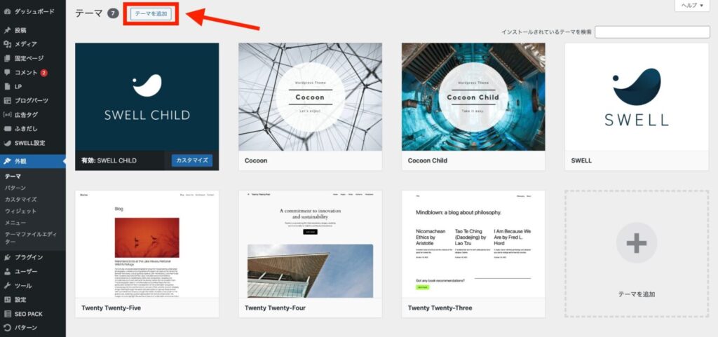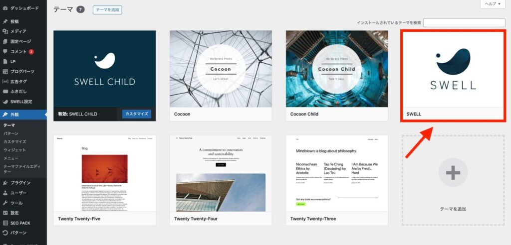 SWELLをダウンロードできたら、WordPressでテーマを読み込んでいきます。