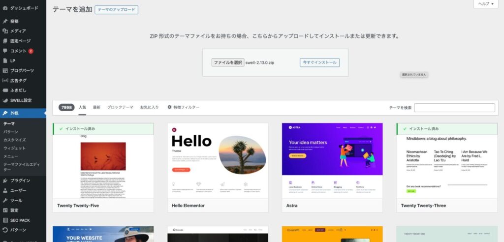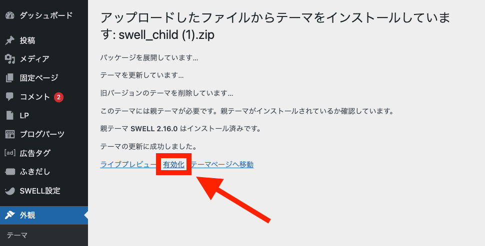 これで子テーマのアップロードが完了したので、SWELLのインストール手続きは完了です。