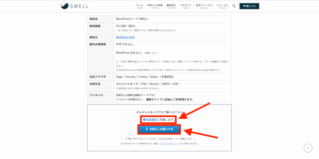 利用規約にチェックを入れて、「SWELLを購入する」をクリックします。