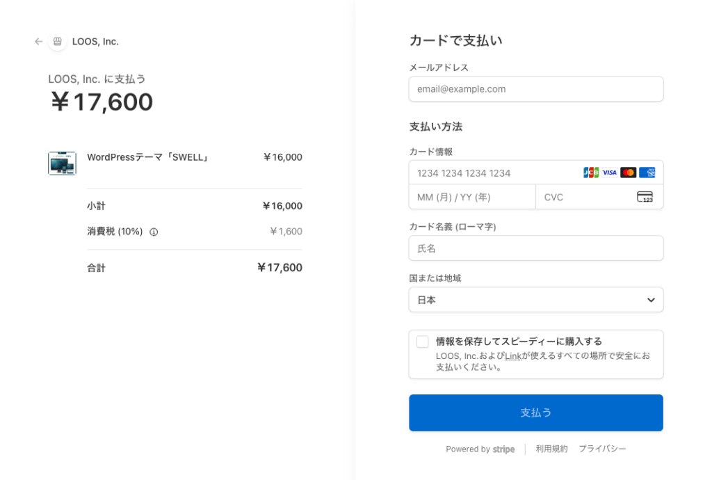 メールアドレス、クレジットカード情報を入力して、「支払う」をクリックします。