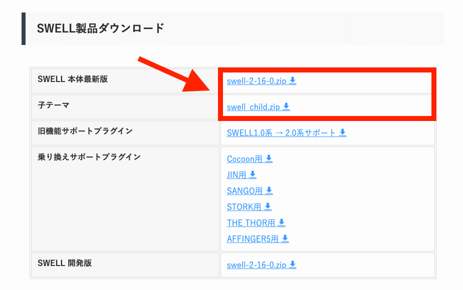 マイページにログインできたら、「SWELL製品ダウンロード」から2つをダウンロードします。