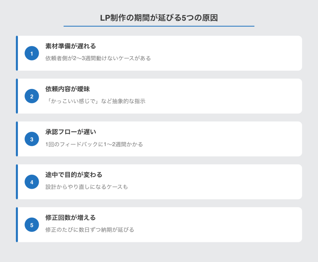 私がこれまで手がけてきた制作案件を振り返ると、LP制作の納期遅延は、ほとんどがこの5つの原因に集約されます。