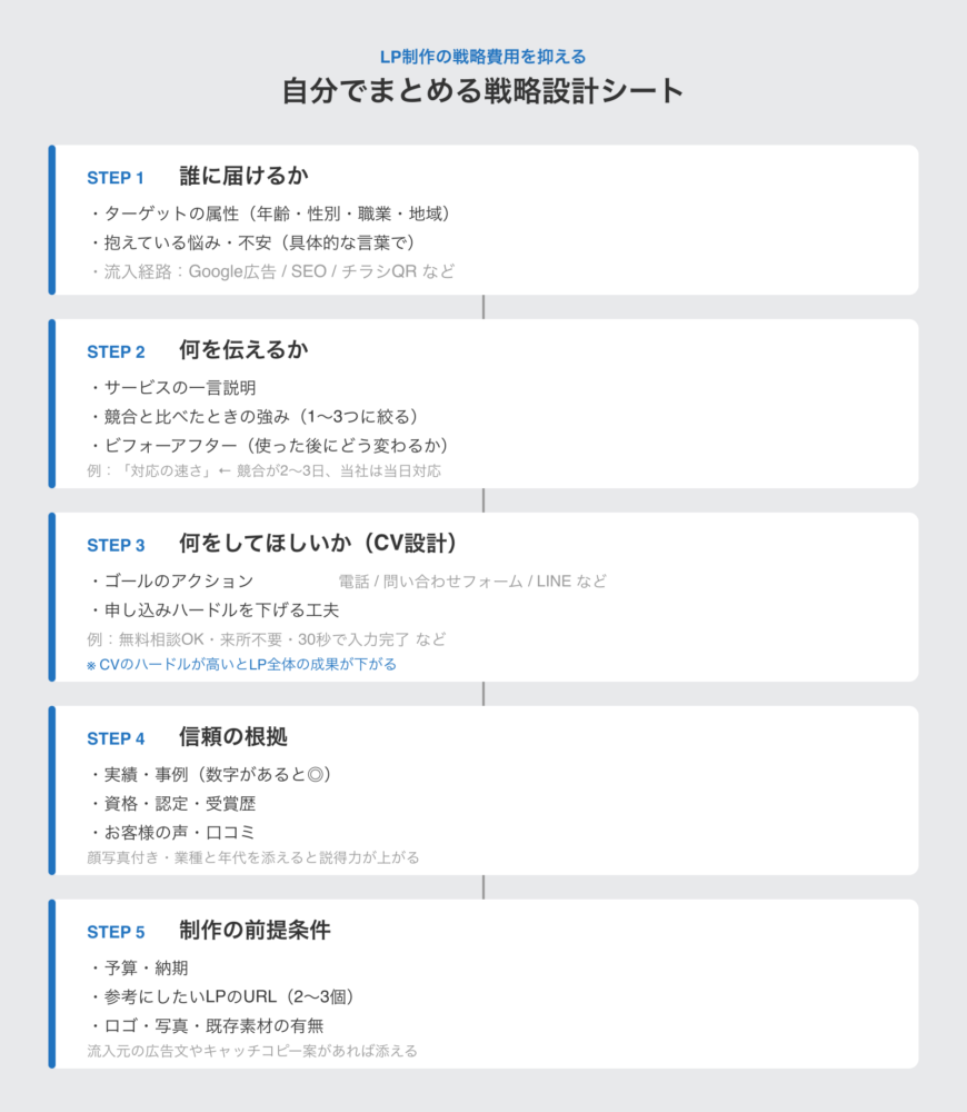 LP制作で最初にやるべきことは、「このLPは誰に何を伝えて、どんな行動をとってもらうか」を決めることです。この3点が曖昧なまま制作を依頼すると、制作者側がヒアリングに時間をかけるか、方向性がズレたまま進んでしまいます。