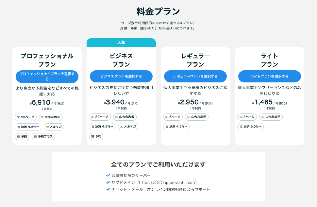 また新規の方はもちろん、ペライチでサイトを運営するなら、必ず有料プランに契約しなければなりません。