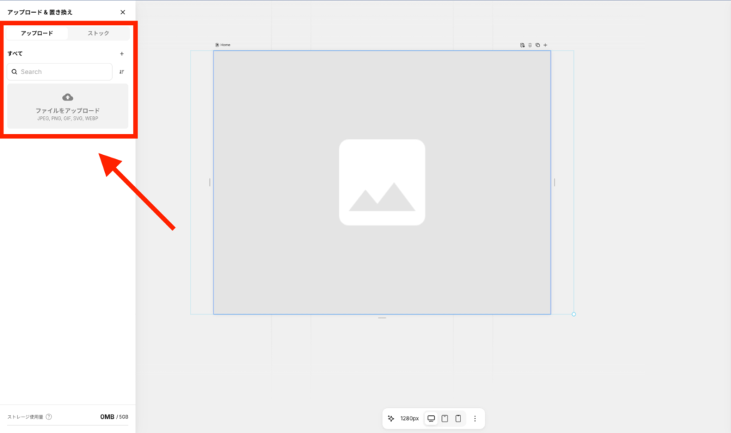 フリー素材で問題ない場合は、Unsplashの画像から選べばOKです。自分で撮影した画像・取得してきた画像を使いたい場合は、アップロードから画像を選択しましょう。