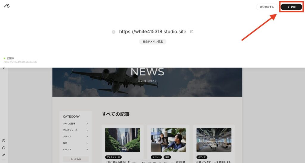 公開中のサイトを編集した場合、「更新」ボタンをクリックしないとサイトは上書きされません。