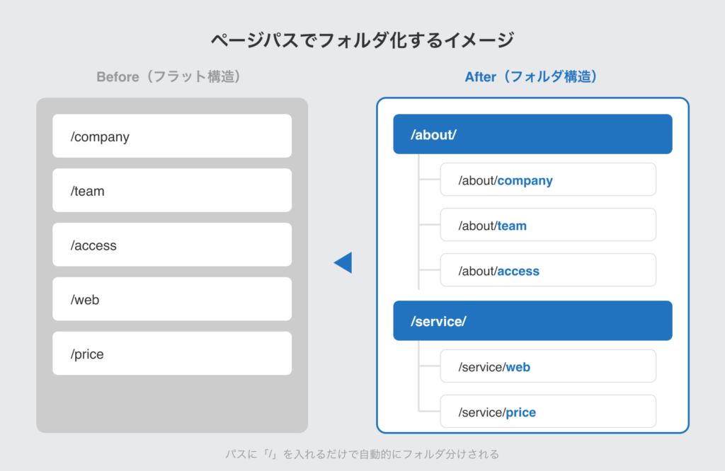 フォルダ化すると「会社情報」「サービス」「ブログ」のようにカテゴリ単位でページがまとまります。目的のページへ2クリックでたどり着けるため、日々の更新作業がスムーズになります。