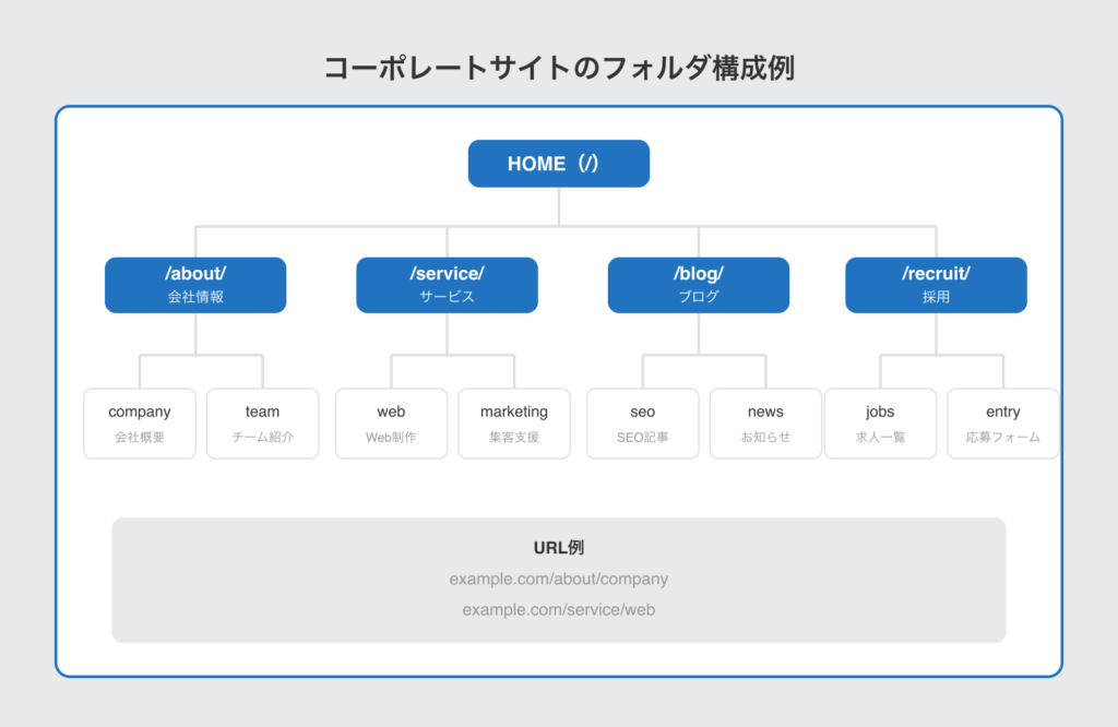 フォルダ化すれば、サイトのページが散らかっていても綺麗に整理することができます。例えば、コーポレートサイトのフォルダ構成例を見てみてください。