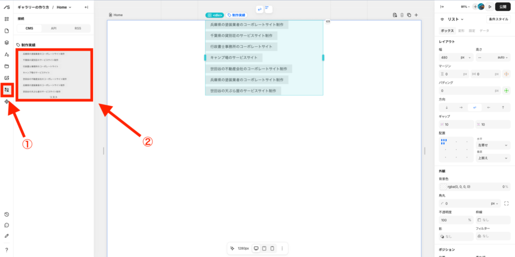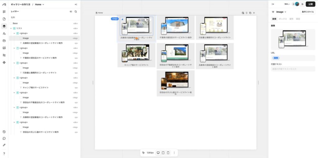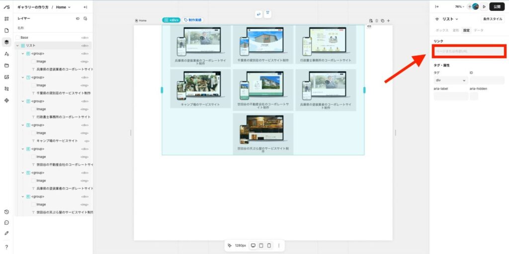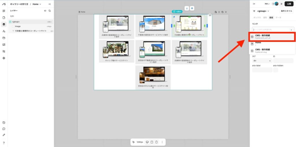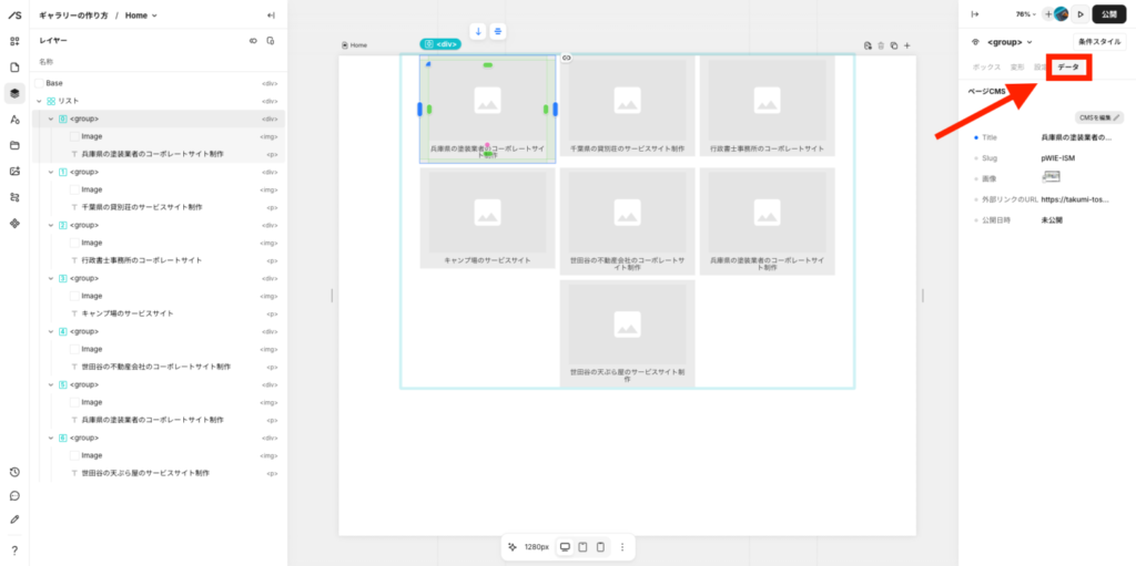 左メニューのレイヤーを開いて、「制作事例の画像」と「タイトル」と「サイトURL」をそれぞれ紐づけていきます。