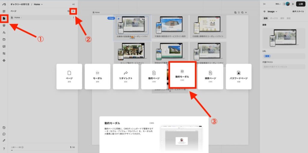 ページ追加をクリックして、「動的モーダル」を選択します。