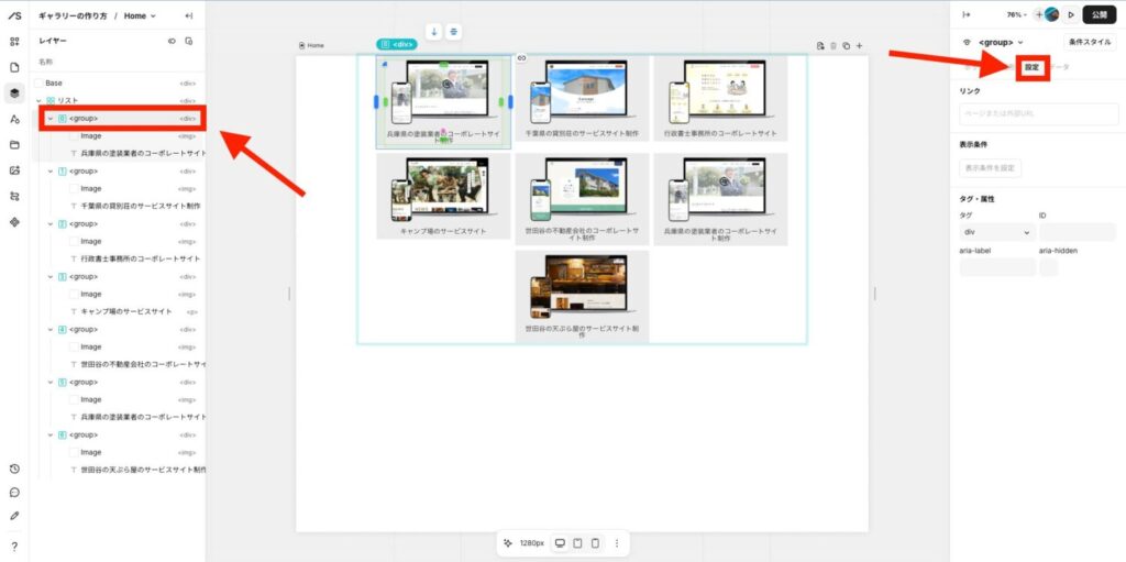 番号が付いている<group>タグをクリックして、右パネルの「設定」をクリックします。
