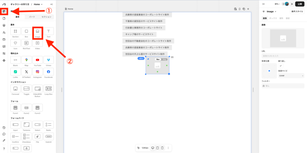 画像を追加したいので、左メニューの「追加」→「ボックス」→「Image」をクリックします。