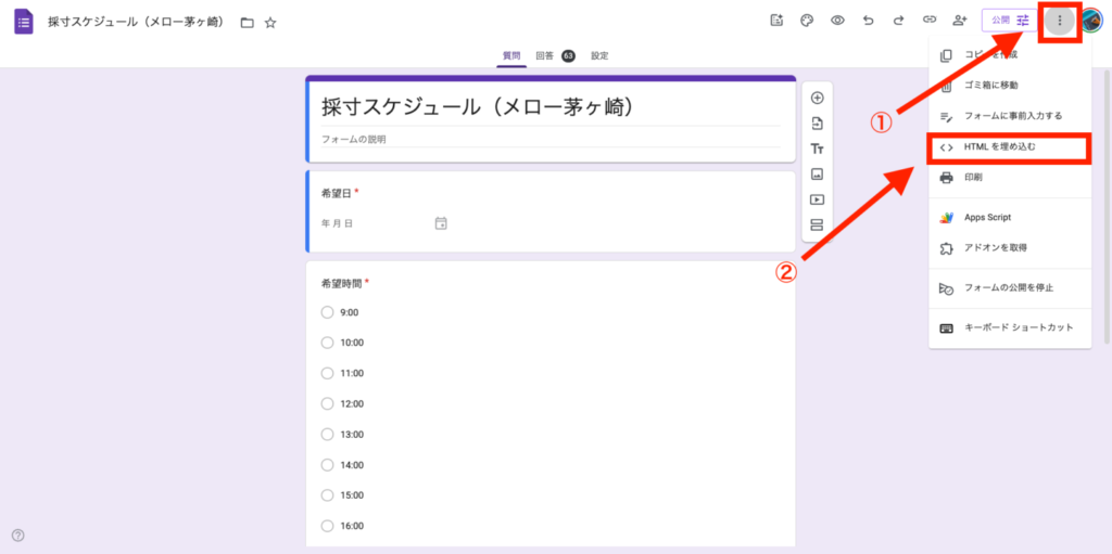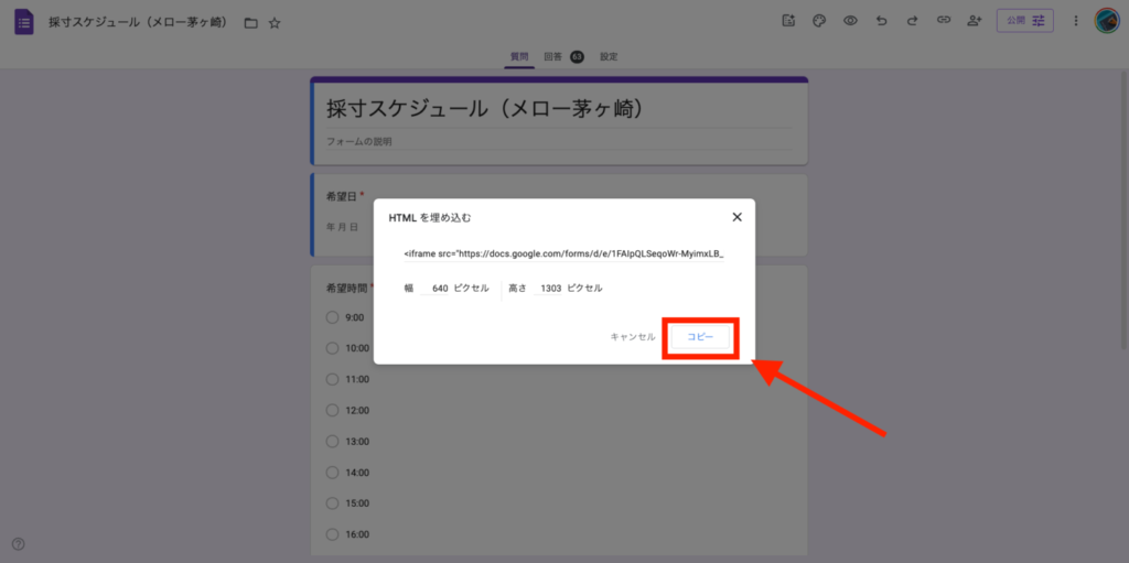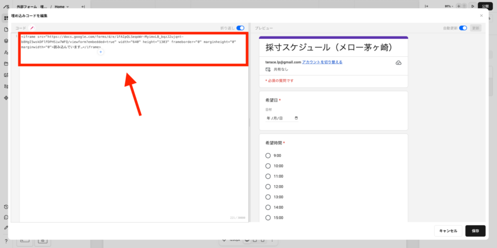 埋め込みコードの入力欄に、先ほどコピーしたGoogleフォームのコードを貼り付けます。