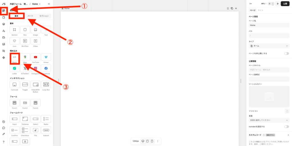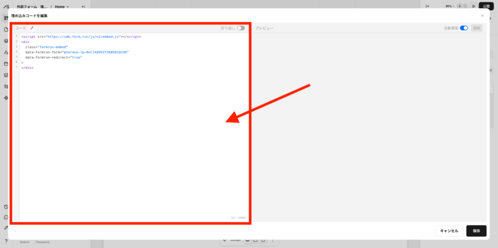 先程formrunで取得したスクリプトを、埋め込みコードの入力欄に貼り付けます。