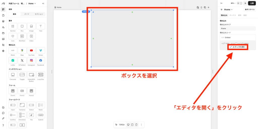 追加された<iframe>ボックスを選択した状態で、右パネルの「エディタを開く」をクリックします