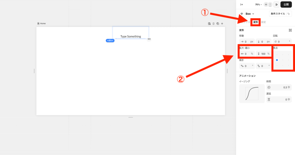 ボックスを選択した状態で、右パネルの「変形」のタブを開き、下記のように設定します。