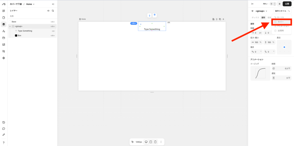 グループを選択した状態で、条件付きスタイルの部分を「なし」→「ホバー」に変更します。