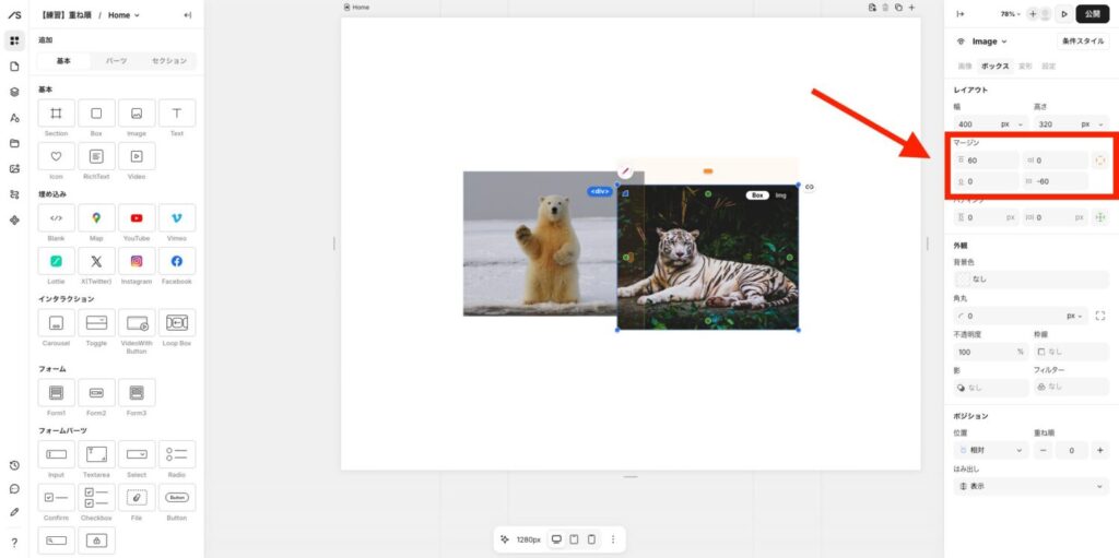 ライオンの画像を選択しながら、マージンを下記のように設定します。(上方向に60px、左方向に-60pxのマージンを当てています)