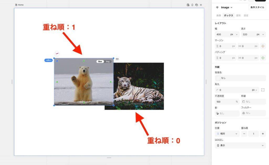 例えば、トラの画像を上に重ねたいなら、トラの重ね順を1以上に設定します。