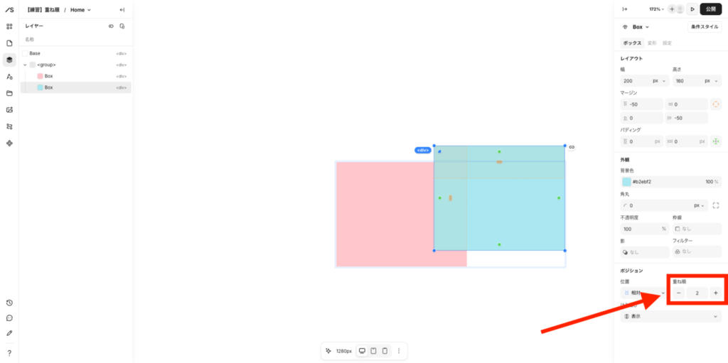 例えば、ボックスを最下層にしたいなら「重ね順:-3」を選択して、最上層にしたいなら「重ね順:5」を設定すればOKです。