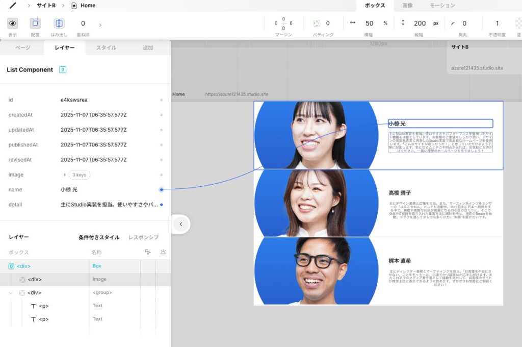 点と点を繋いで、コンテンツデータの「メンバー写真・名前・紹介文」を紐づけていきます。