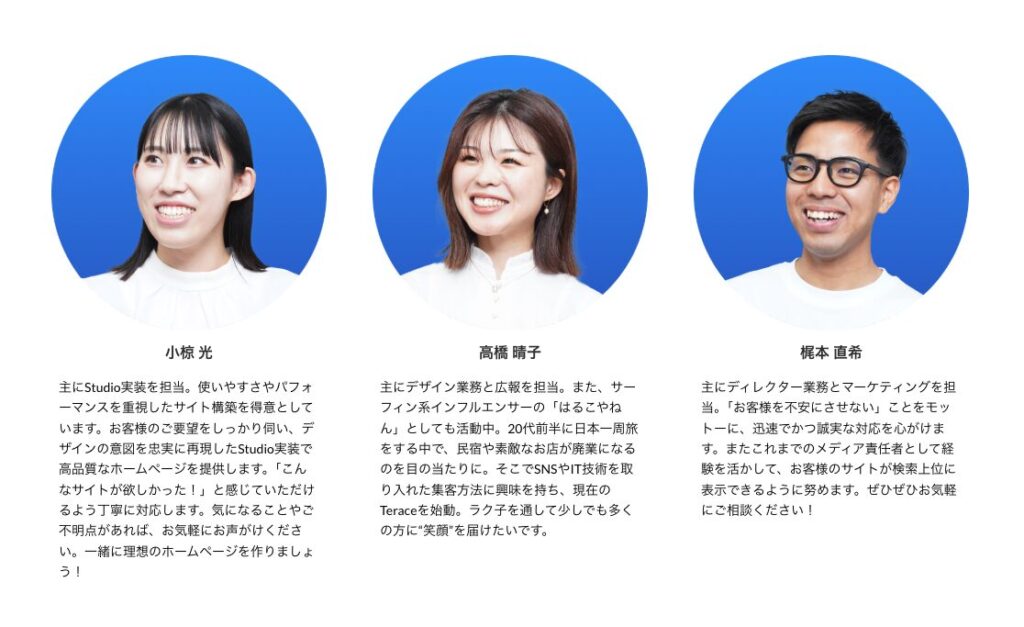 最安15万円〜からホームページが作れて、すべてオリジナルデザインで制作可能です。また自社管理できる「Studio」というツールを用いているので、プランによっては維持費0円で運営できます。