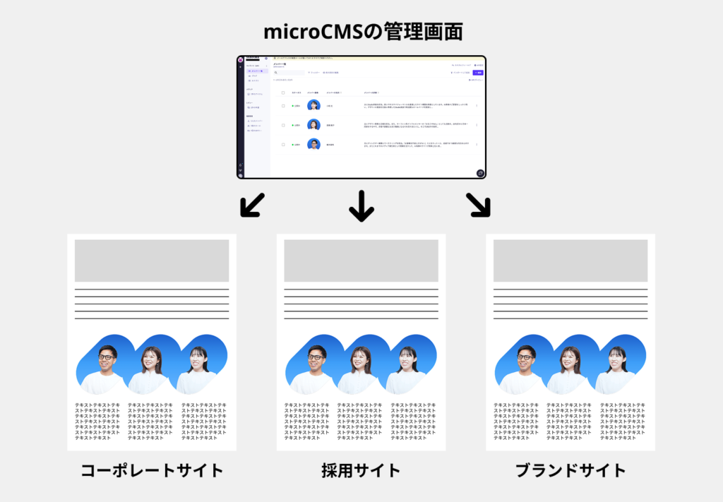たとえば、コーポレートサイトはStudioで、採用サイトやブランドサイトはWordPressなど別の環境で作られているケースでも、microCMSを通じて情報を一括管理できます。