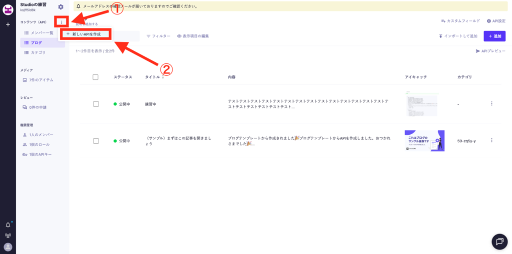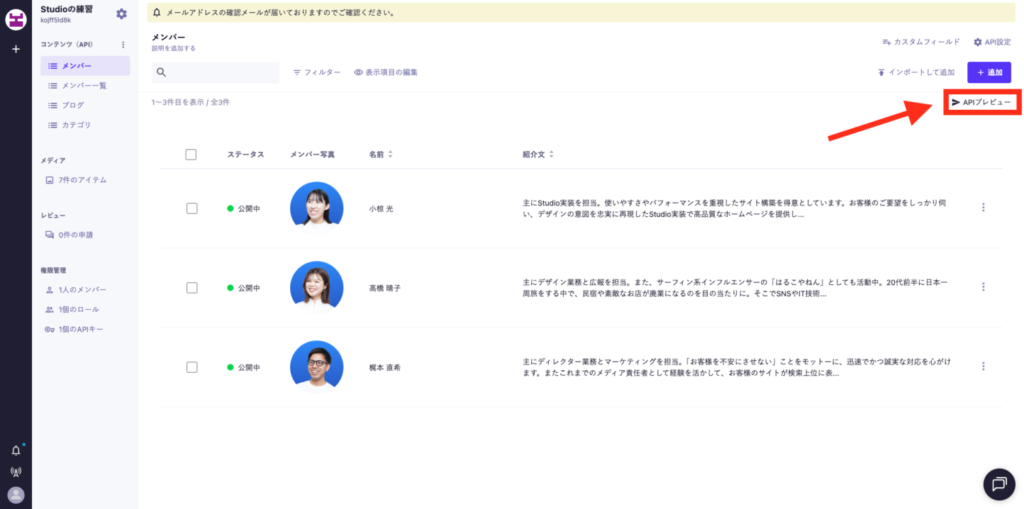 microCMSに戻って、「APIプレビュー」をクリックします。
