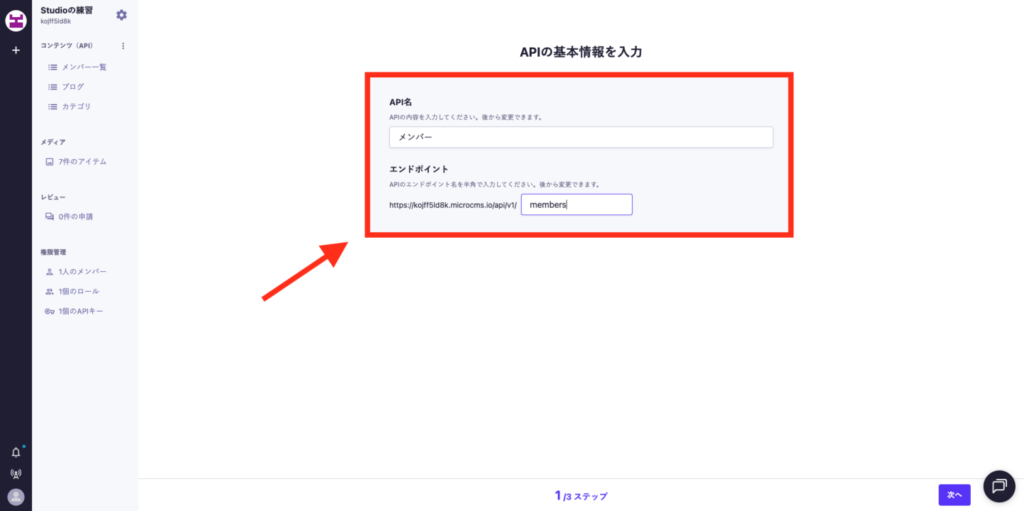 API名とエンドポイントを入力して、「次へ」をクリックします。