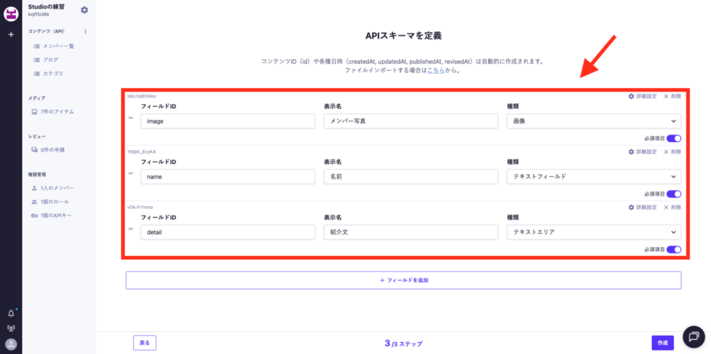 今回は「メンバー写真・名前・紹介文」を記載したいので、3つのフィールドを用意して、「作成」をクリックします。