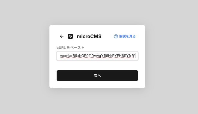 cURLの入力欄に、先ほどコピーしたcURLを貼り付けます。「次へ」をクリックします。