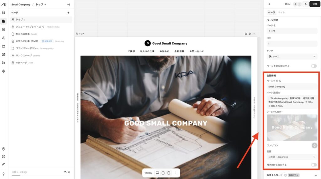 画像・文章などの変更ができてデザインが完成してきたら、次にサイト設定・ページ設定をやっていきます。