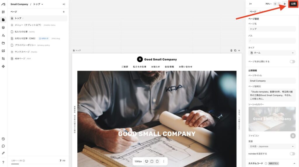 ページ数は7ページで構成されているため、プランだと無料プランもしくはPesonalプランあたりがおすすめでしょう。